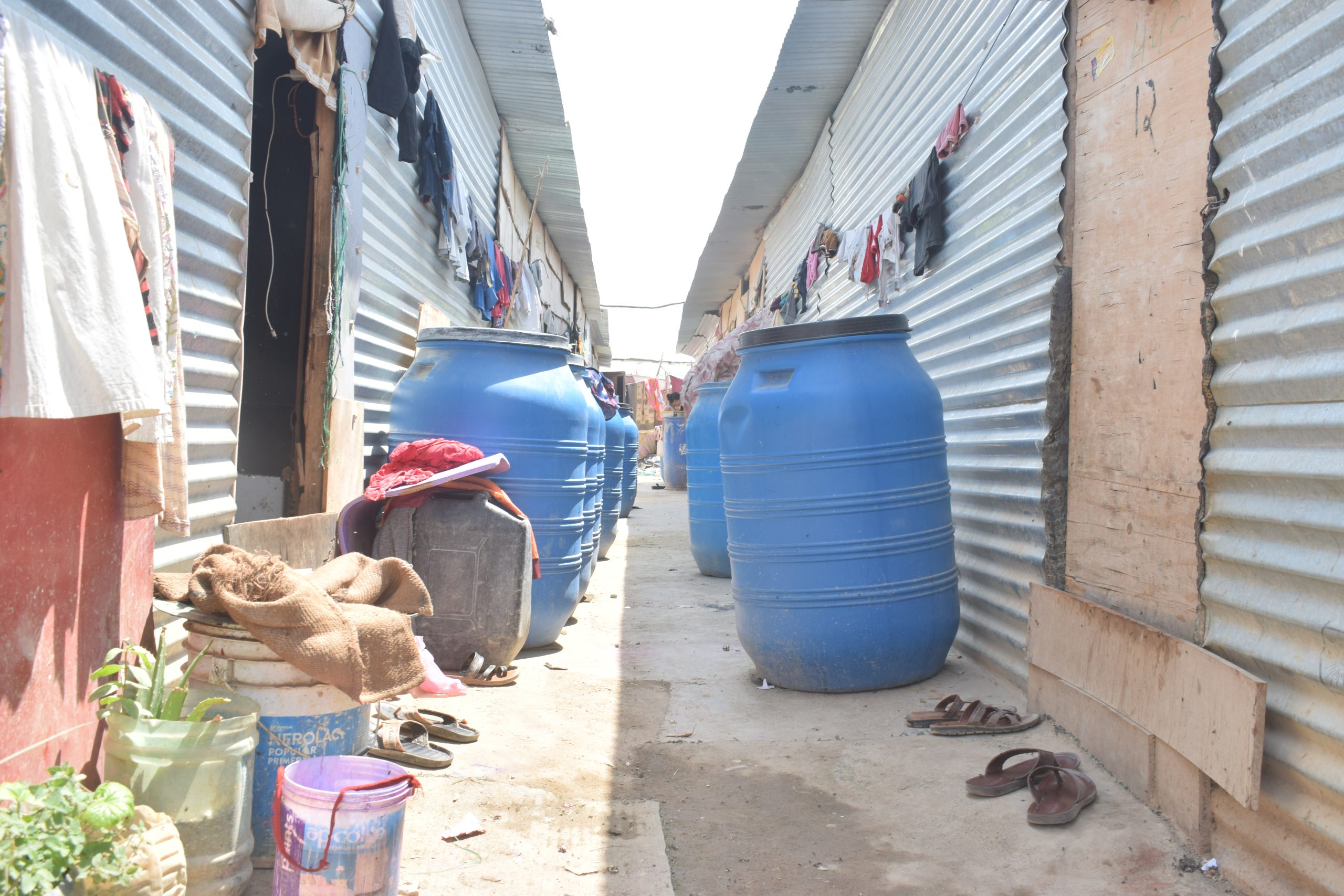 Ubiquitous blue drums, a familiar sight outside migrant households in Kariyammana Agrahara in Bengaluru. Vikrant Anand/ The Migration Story
