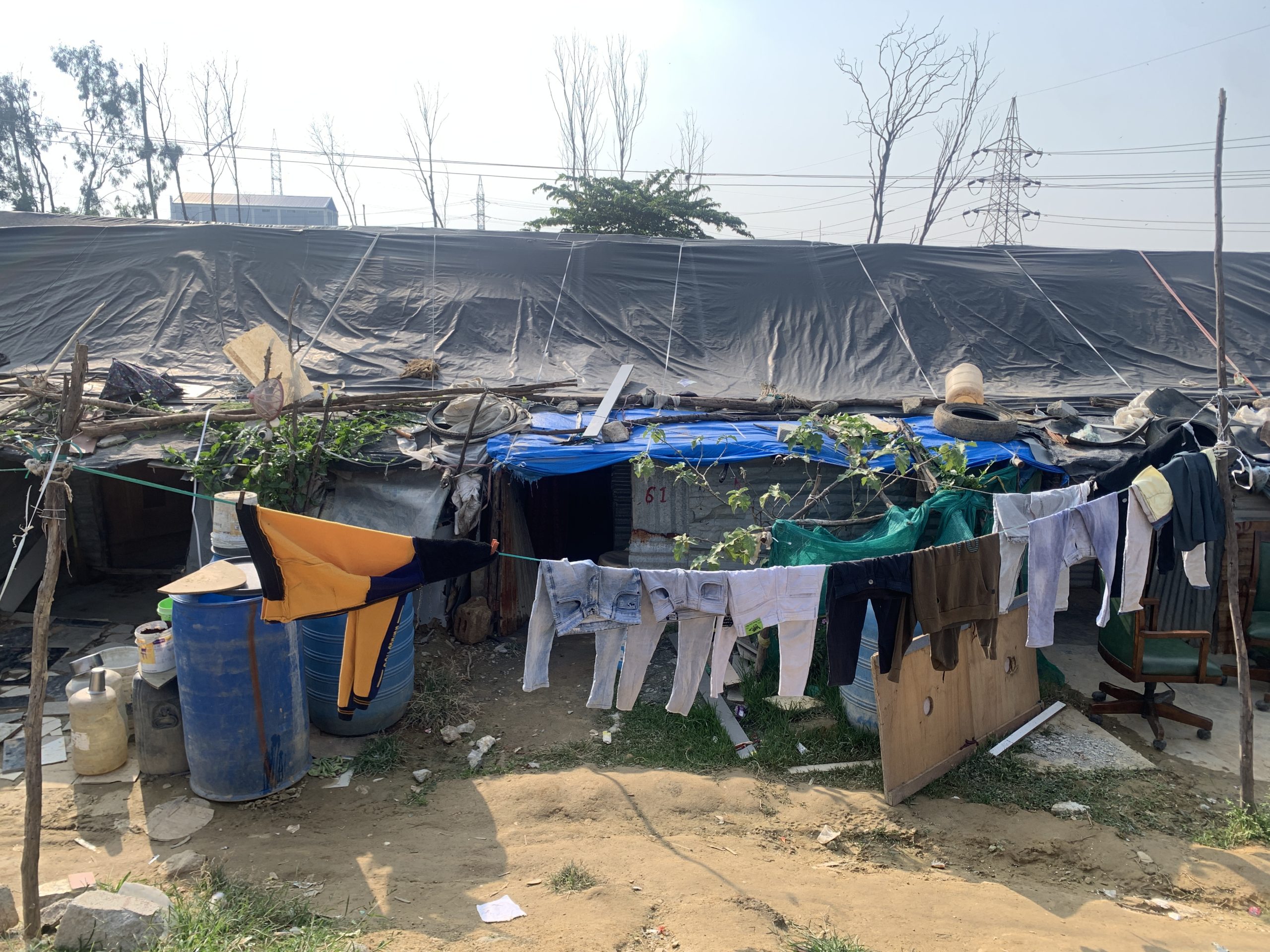 A migrant settlement in Bengaluru, with compact, one-room homes arranged in closely packed parallel rows_ their roofs all covered with black tarpaulins. Anuradha Nagaraj/The Migration Story