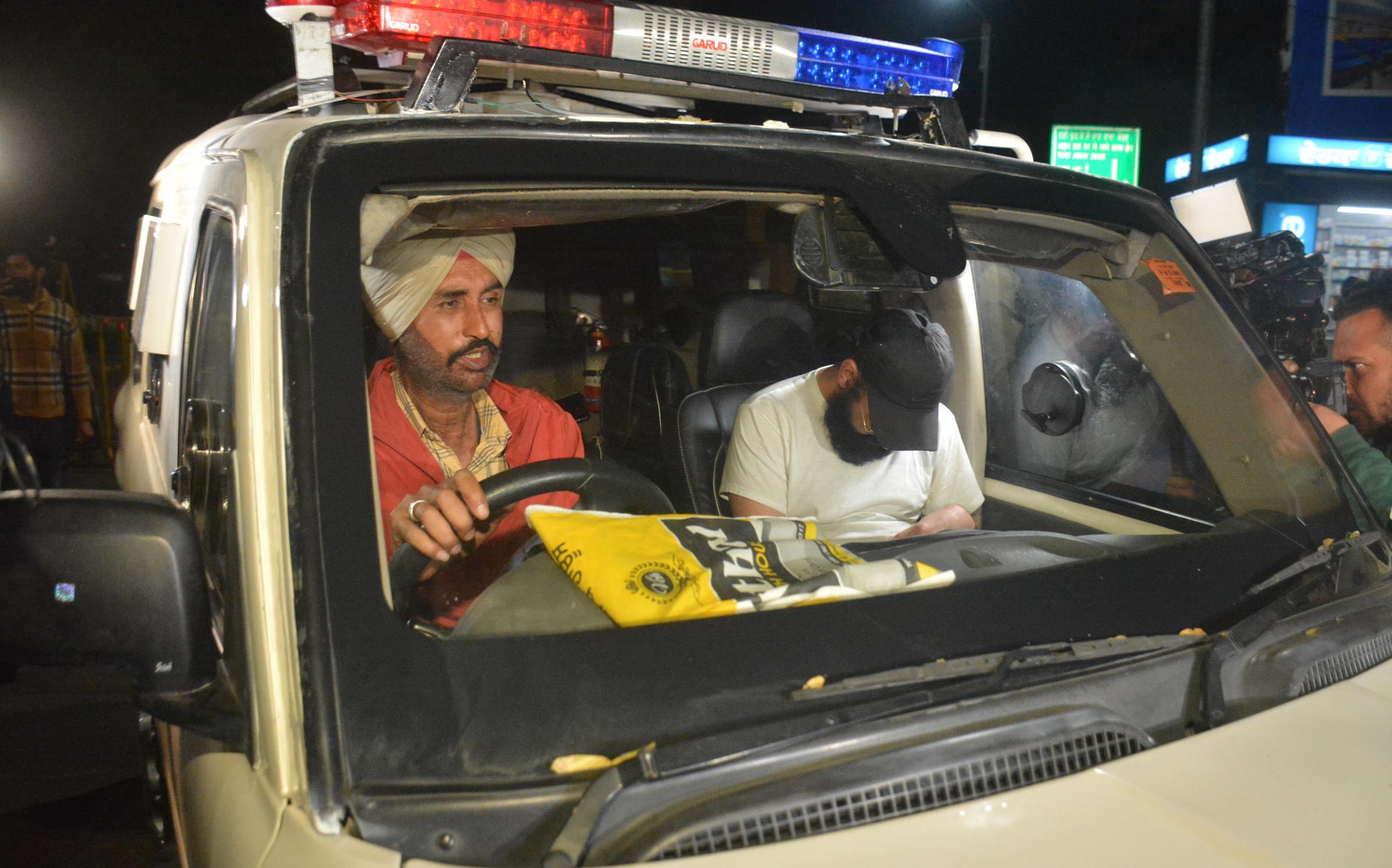 A man deported from the U.S. (R) looks down in a car as a media scrum stands outside in Punjab on