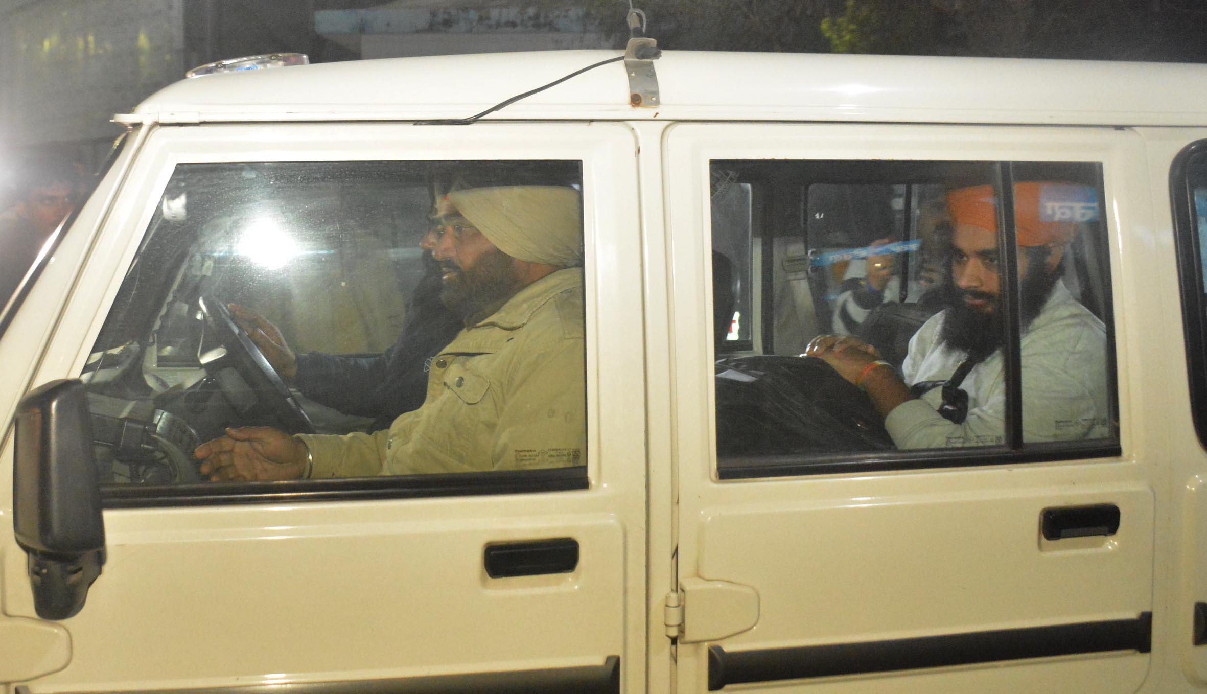 A man deported from the U.S. sits at the back of a police-escorted car in Punjab on February 5, 2025.