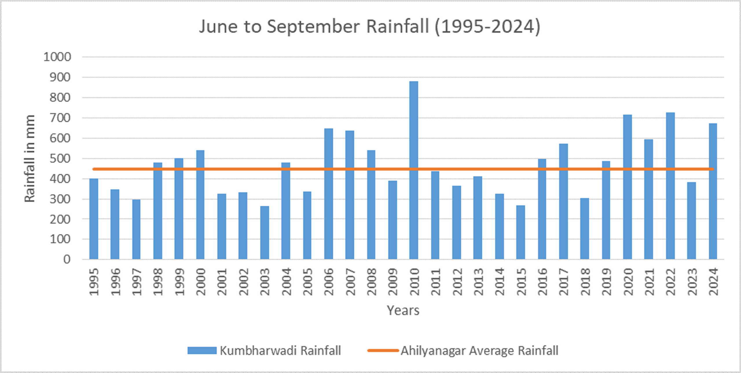 From 1995 to 2024, Kumbhawadi received rainfall below Ahilyanagar’s June-September average of 448 mm in 15 out of 30 years, making the village prone to drought (Graph 1). The farmers majorly cultivated pearl millet during the monsoon season, and a few handful of farmers produced sorghum during the winter season due to limited availability of water resulting in poverty. In 1998 (WRI, 2013), half the land was deemed unproductive, forcing families to migrate for 6-7 months each year, creating a situation of hardship.