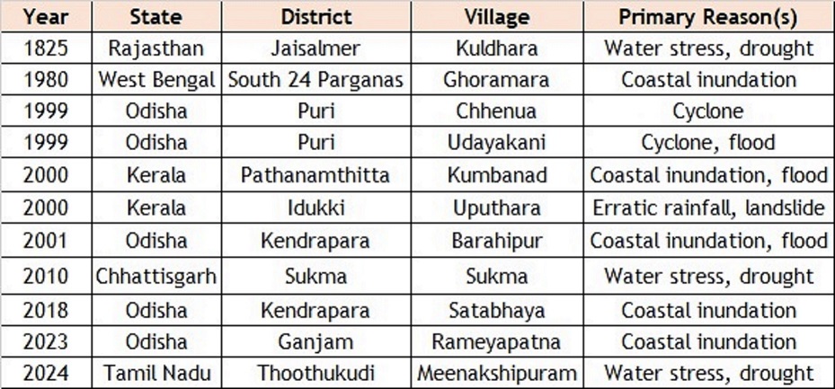 Climate stressors such as droughts and floods push farmers and farm laborers to migrate in search of alternative livelihoods. Between 2008 and 2023, more than 56 million (Statista, 2024) people were internally displaced by climate-related disasters. Numerous villages have been abandoned (Mohraj et al., 2025) over the years due to such events (Table 1), underscoring that migration is often a response to climate uncertainty rather than mere economic aspiration.