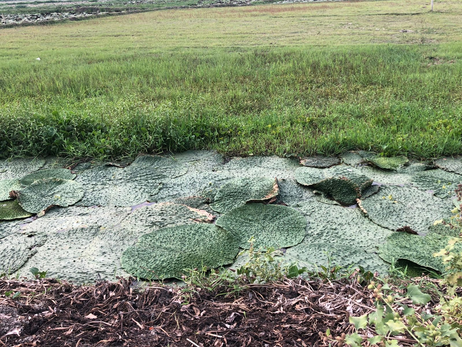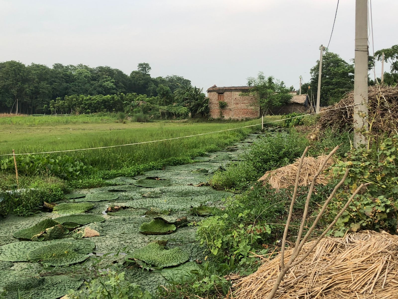 Large lotus leaves spread across a narrow water channel running along the fields in Murli Basantpur village, Saharsa. Shaba Manzoor/The Migration Story