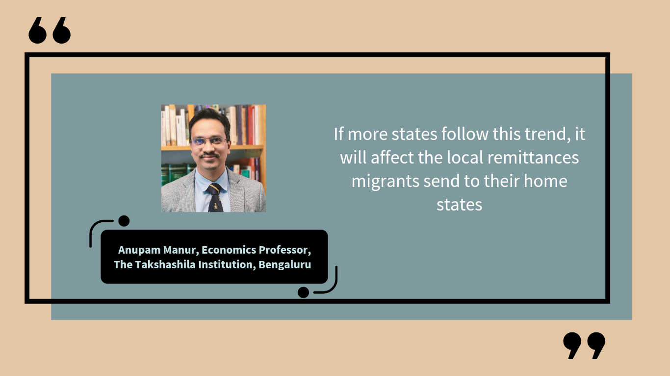 According to Manur, policies that reserve jobs for locals greatly reduces the option for migration and creates a hostile environment for job seekers. “If increasingly more states do it, it will impact local remittances that are sent to source states. In most cases, when migrant workers return to their home states for the lack of opportunities, they engage in agriculture or other low productive jobs which has adverse effect,” he added.