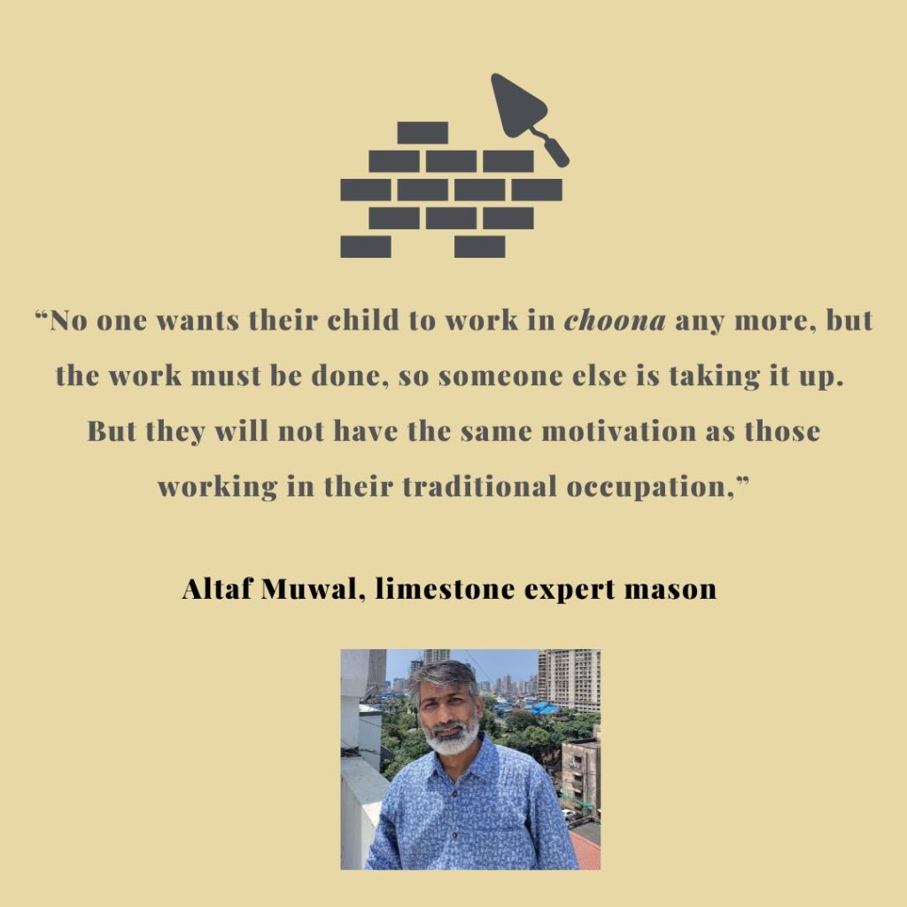 “No one wants their child to work in choona any more, but the work must be done, so someone else is taking it up. But they will not have the same motivation as those working in their traditional occupation,” said Muwal, who said he was fortunate to have landed a job a job to supervise workers for conservation architect Dilawari, but many have changed their fields because of lack of work, some returning to their villages or migrating to the Gulf countries.