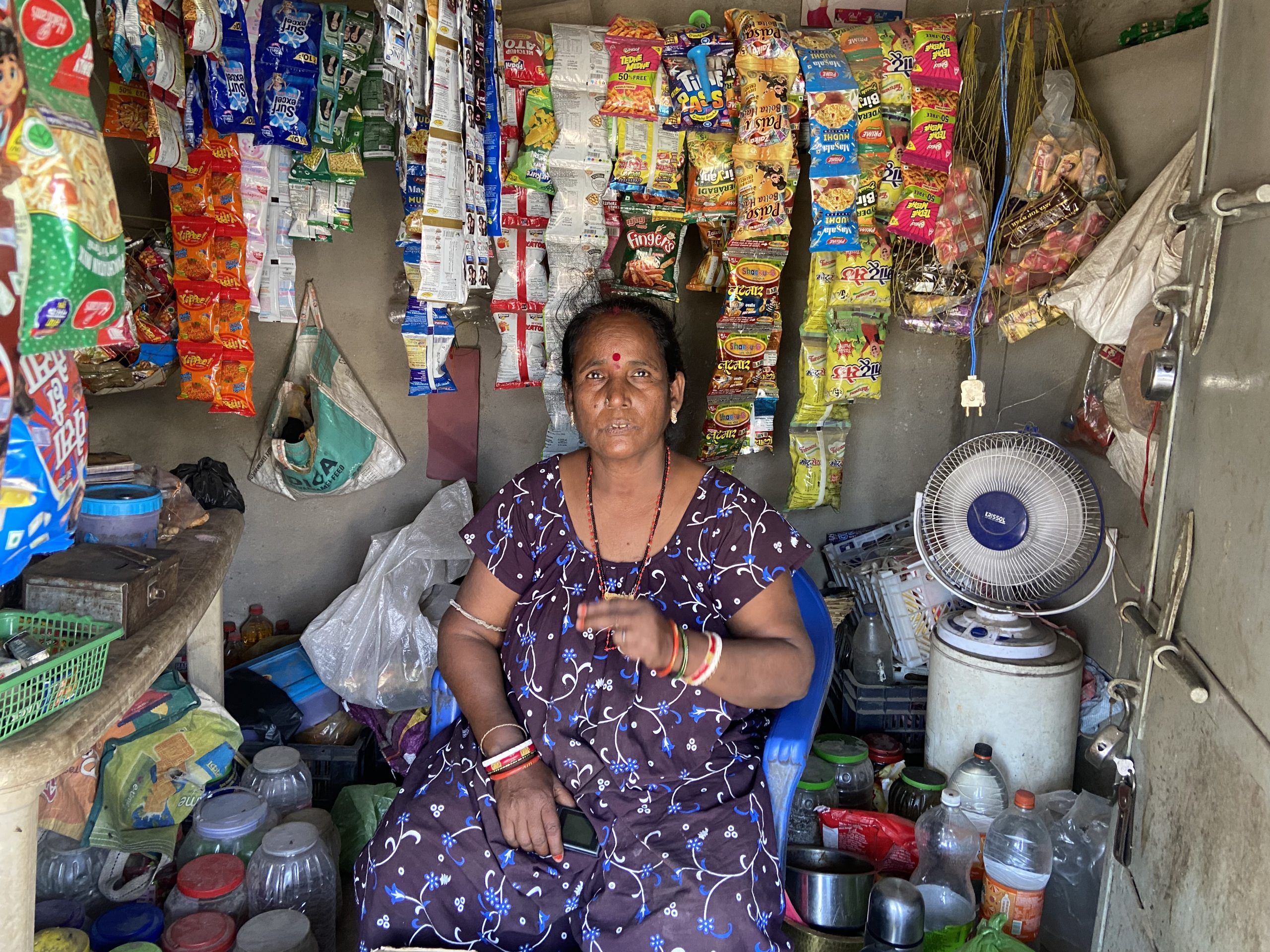 Among those who have set up shop here is Draupadi Raut. Her matchbox-sized store is stacked with bags of crisps, cookies, and dozens of small tobacco pouches in a polythene bag. The 47-year-old worked at the old plant for over two decades, earning a monthly income of 12,000 rupees, which she said was steady, unlike her income now.