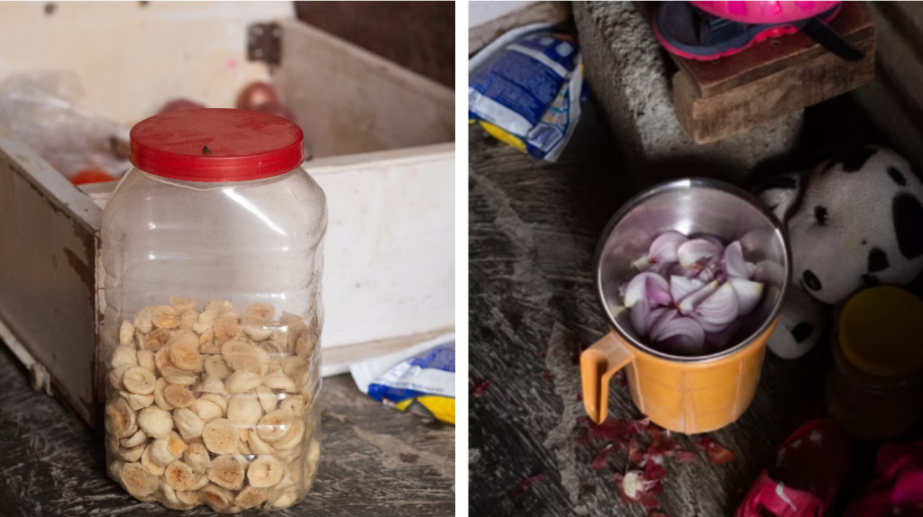 Manisha’s kitchen, like that of most working-class migrants, is compact and utilitarian – tomatoes for the evening meal soak in a bowl of Bisleri water and red onions rest under a shelf carrying plastic containers of rice and soya chunks. Metal utensils and dishes dry upturned on a blue cloth spread across a wooden table and baby eggplants, long beans, and bitter gourd are collected in a basket for tomorrow’s sabzi. A pouch of turmeric, left corner snipped for easy tadkas, leans against a repurposed plastic bottle filled with Ruchi Gold palm oil.