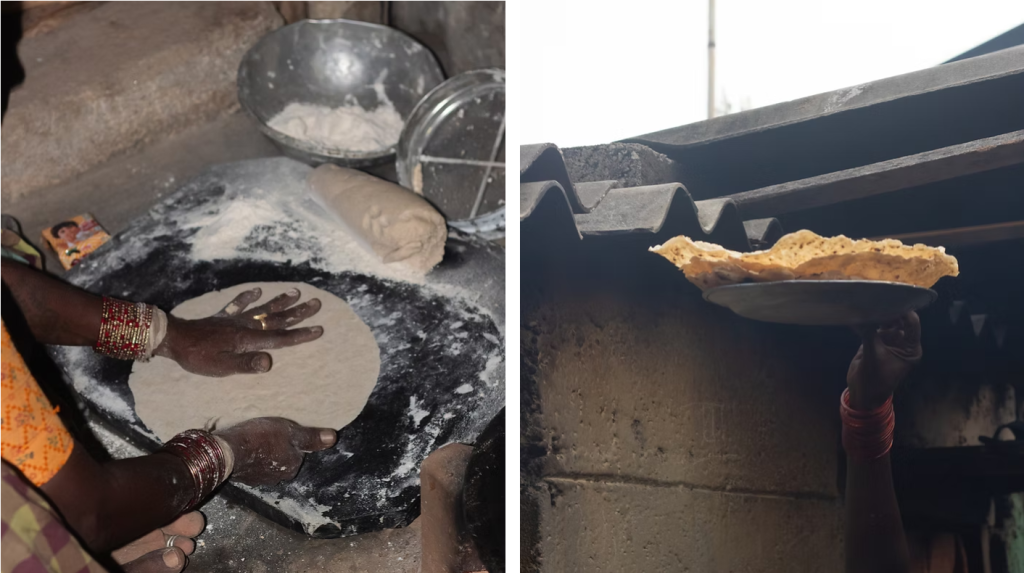 “They make around 50-60 rotis at once. They then dry them in the sun to ensure that when stored, they don’t smell stale or get mouldy,” explained Gayathri Gayu, a field officer at non-profit Migrant Resilience Collaborative. “When sun-dried in this manner, they can be stored for up to a week. Even when they have to visit their hometown, they will take it with them and eat it with curd or shenga (peanut) powder. They will have this even when they have nothing else to eat.”