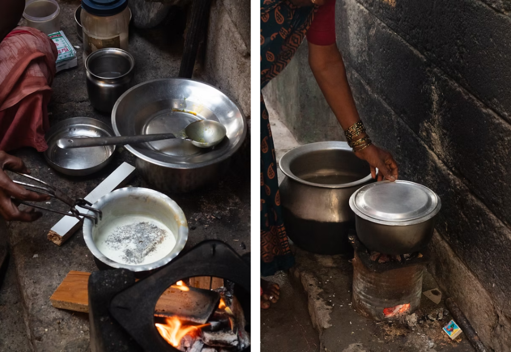 The one-pot method seen at the construction site applies here as well, but in this kitchen, it’s for chitranna (mixed rice). With her daughter balanced on a hip, Mariyamma explains that she’s making this dish since she’s out of vegetables for the week.
