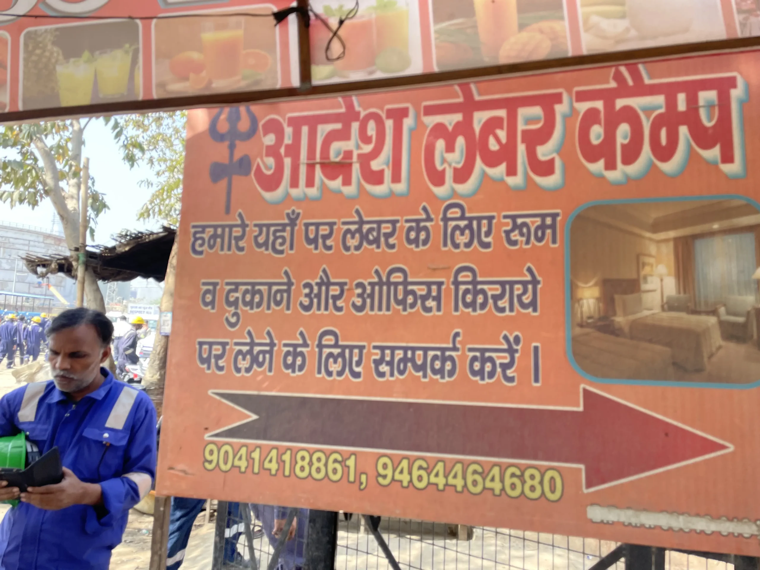 Migrant workers live in labour camps, advertisements for which are found on the shops outside the refinery gate in Panipat, March 2026. Anumeha Yadav/The Migration Story