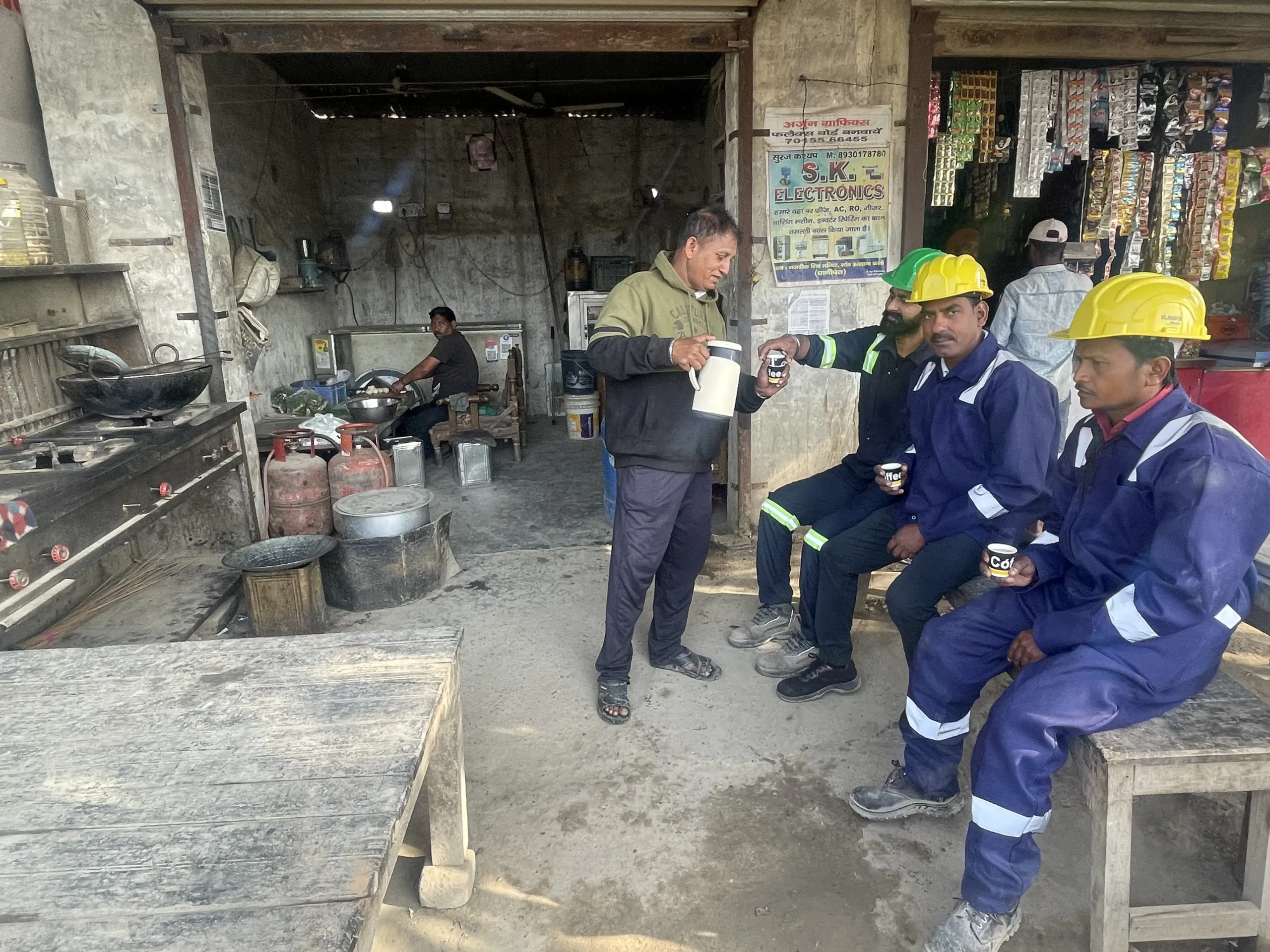 Many workers head to work without any food in the morning and step out for tea at noon, their only break during a 12-hour shift, March 2026. Anumeha Yadav/The Migration Story
