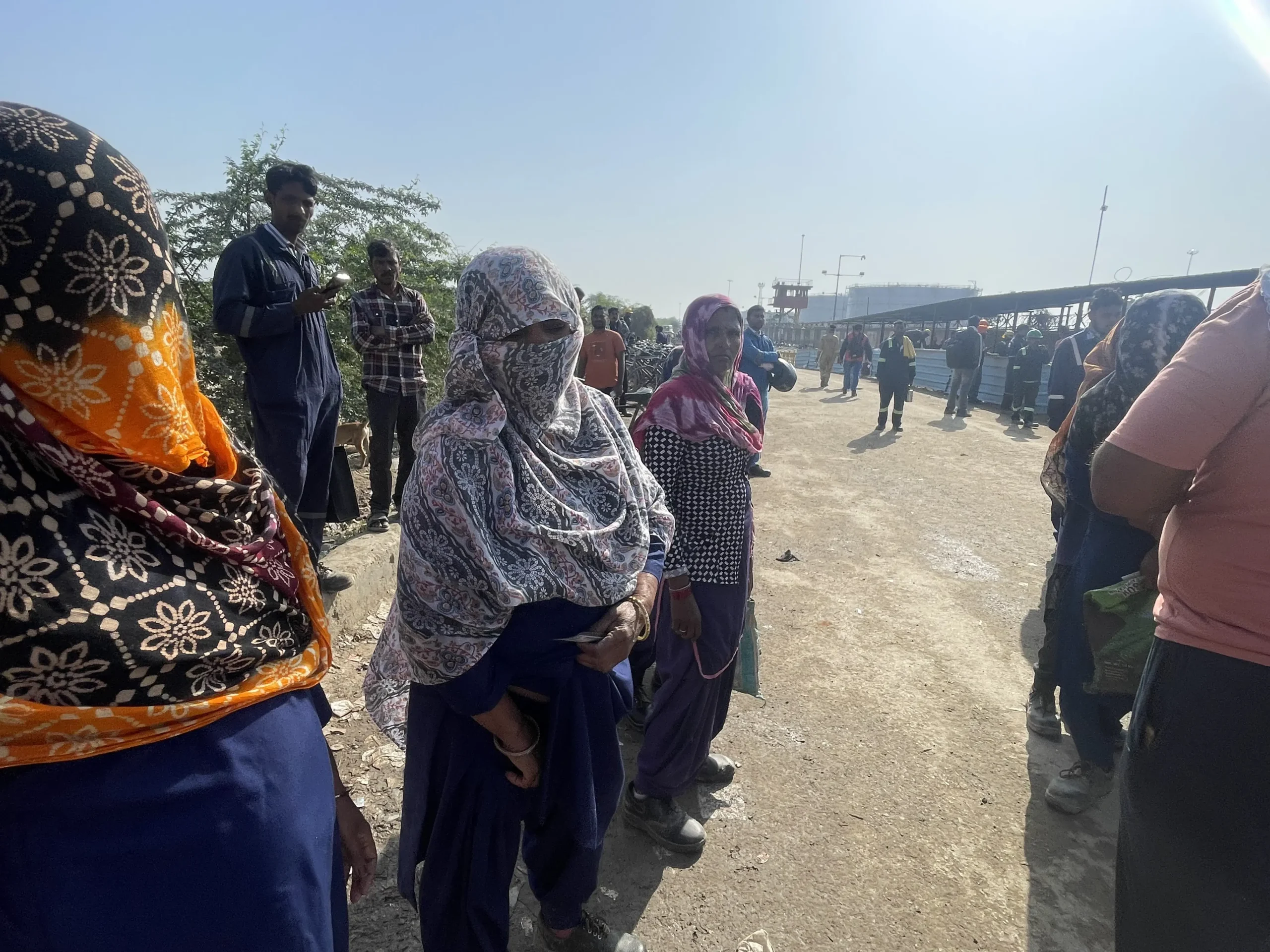 A row of women workers who work as cleaners at the site stood with their faces covered with scarves, waiting to be let inside the refinery at gate 4 after security checked their gate passes.