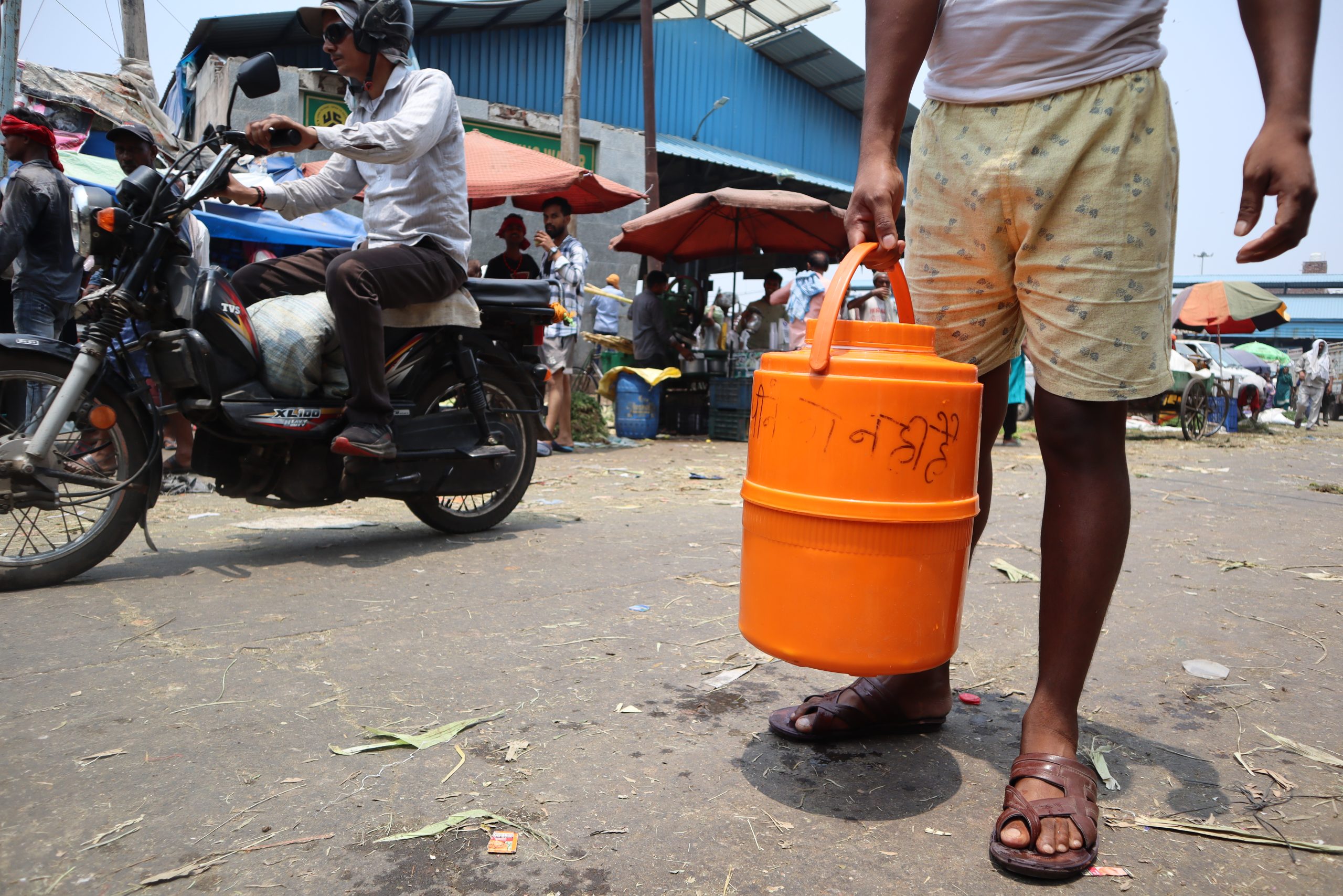A worker carries a water can in Azadpur Mandi in Delhi in mid-June. Sanskriti Talwar/The Migration Story