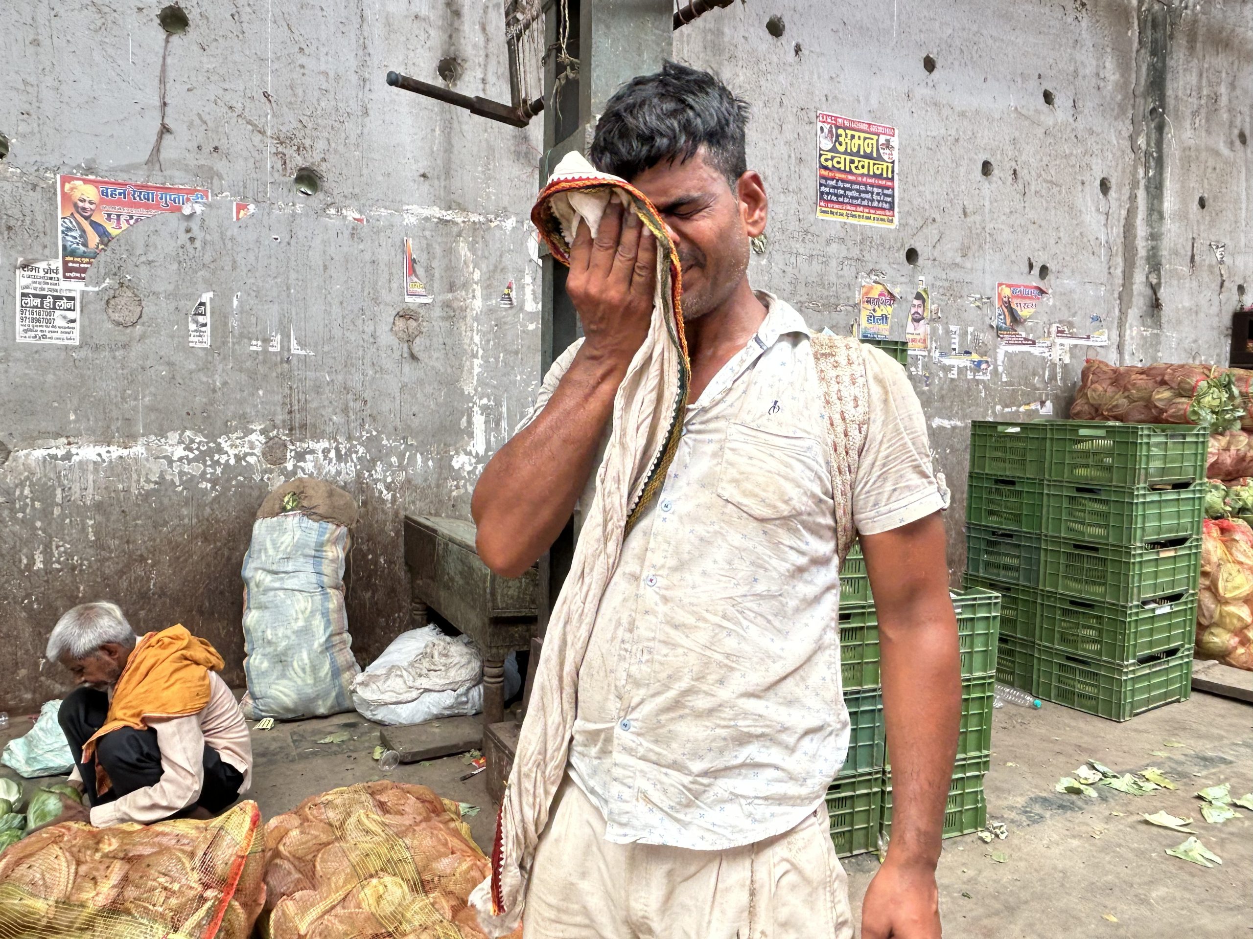 Worker Ramakant Yadav, 36, wipes sweat off his face in the heat of late May at Azadpur Mandi in Delhi. Sanskriti Talwar/The Migration Story