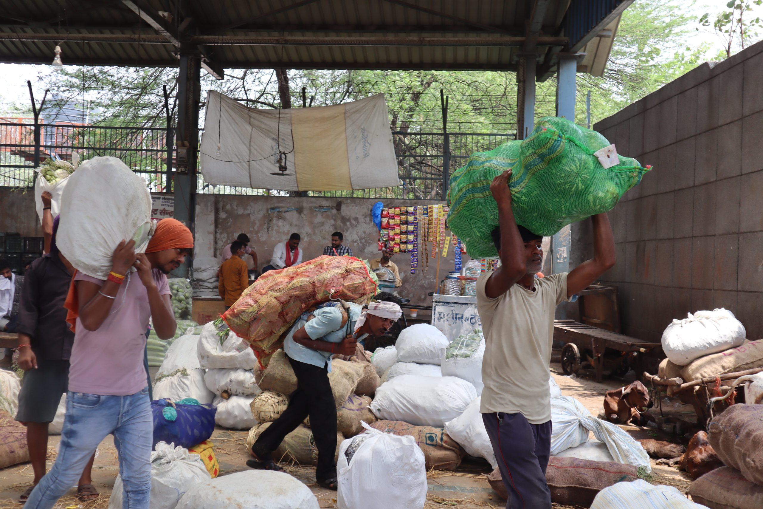 “There’s nowhere to sit,” said 30-year-old Vibhishan Yadav. “If I sit somewhere inside the shed, a commission agent will immediately ask me to get up—after all, he pays to occupy that space. The agent doesn’t understand my helplessness. But when he needs help to move his vegetables, he’ll call me. We loaders have to stay here, so we have to listen.”