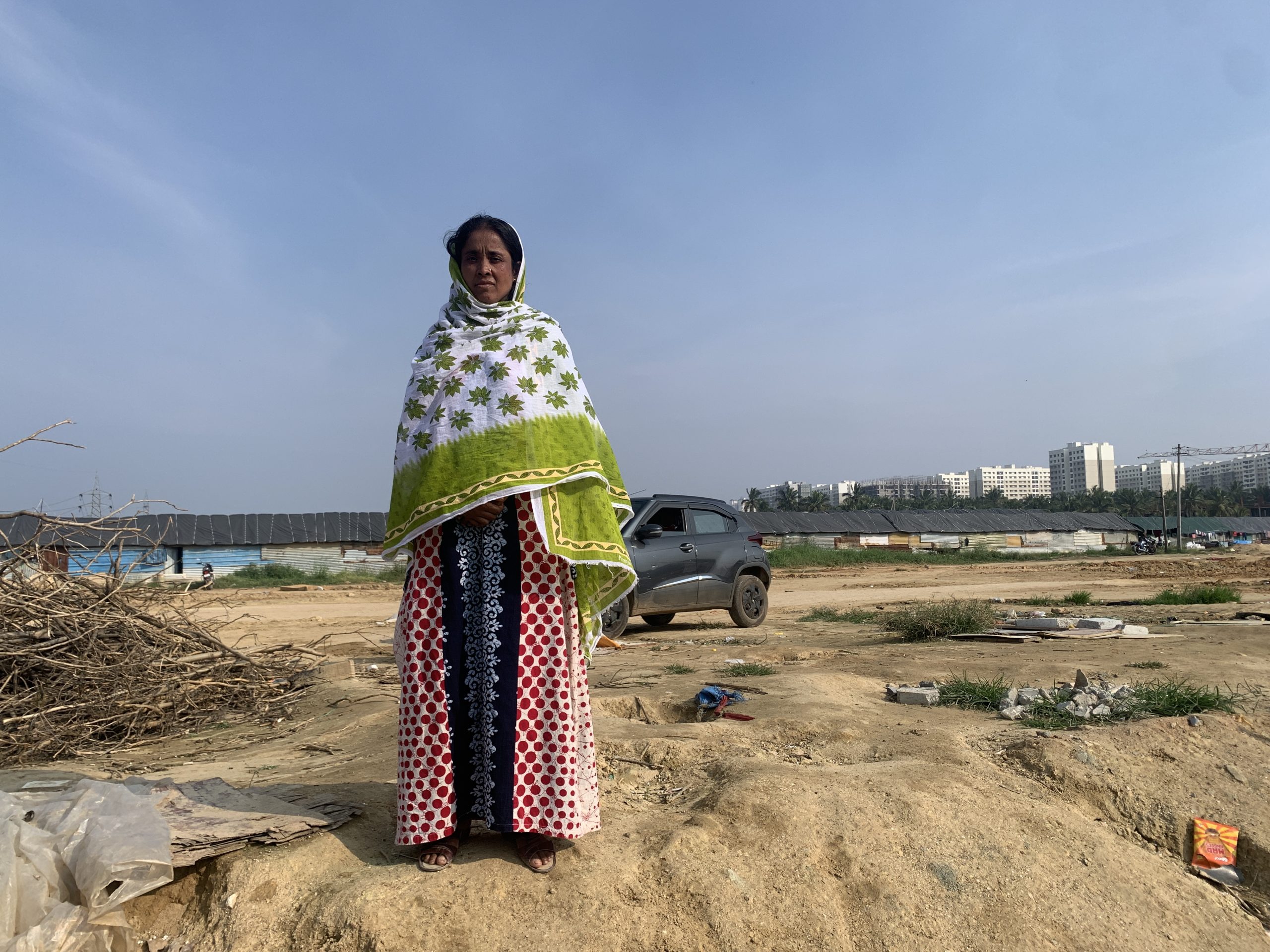 An uneven road branching off the Balagere- Varthur main road, situated in the Eastern periphery of Bengaluru, leads to a cluster of migrant hutments that house Khan’s family. These settlements consist of compact, one-room homes arranged in closely packed parallel rows; their roofs all covered with black tarpaulins. Tucked away from the main road, this cluster of shanties sits amid the towering high-rises of Marathahalli, Sarjapur, and Whitefield—home to some of Bengaluru’s top multinational software companies.