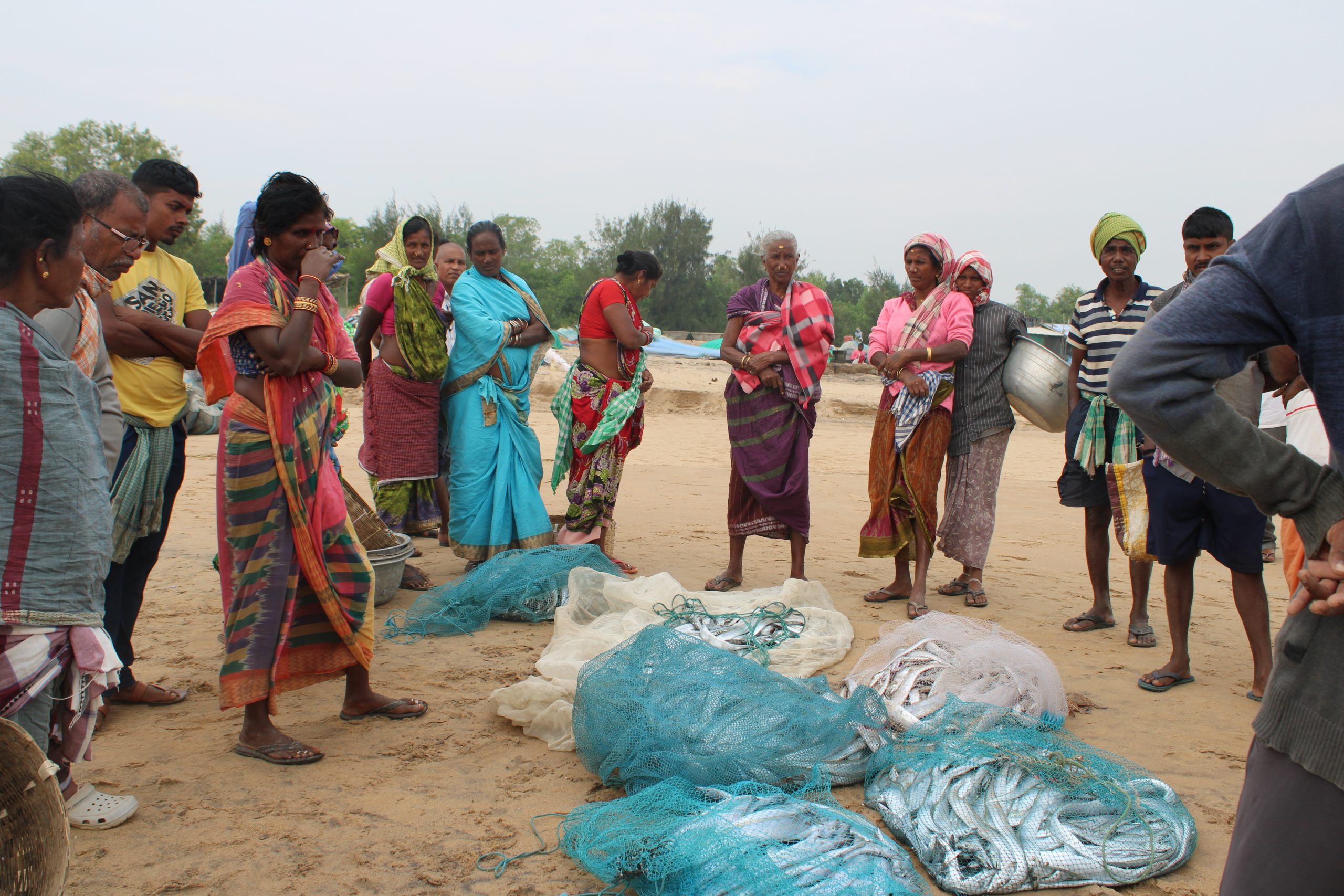 Women gather to strike a bargain on the fish catch unloaded from a boat to sell in the market, at Rushikulya beach in Ganjam district, Odisha. Rakhi Ghosh/ The Migration Story