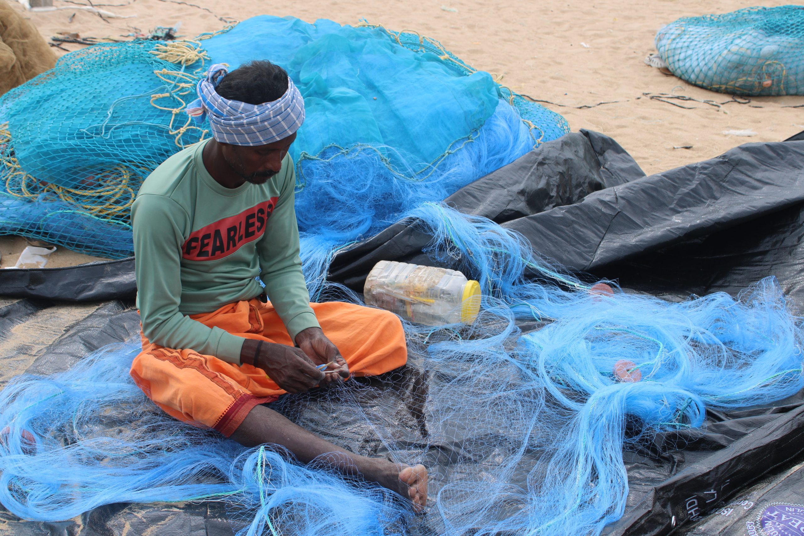 A fisherman knits a fishing net during his free time at Rushikulya beach in Ganjam district, Odisha.