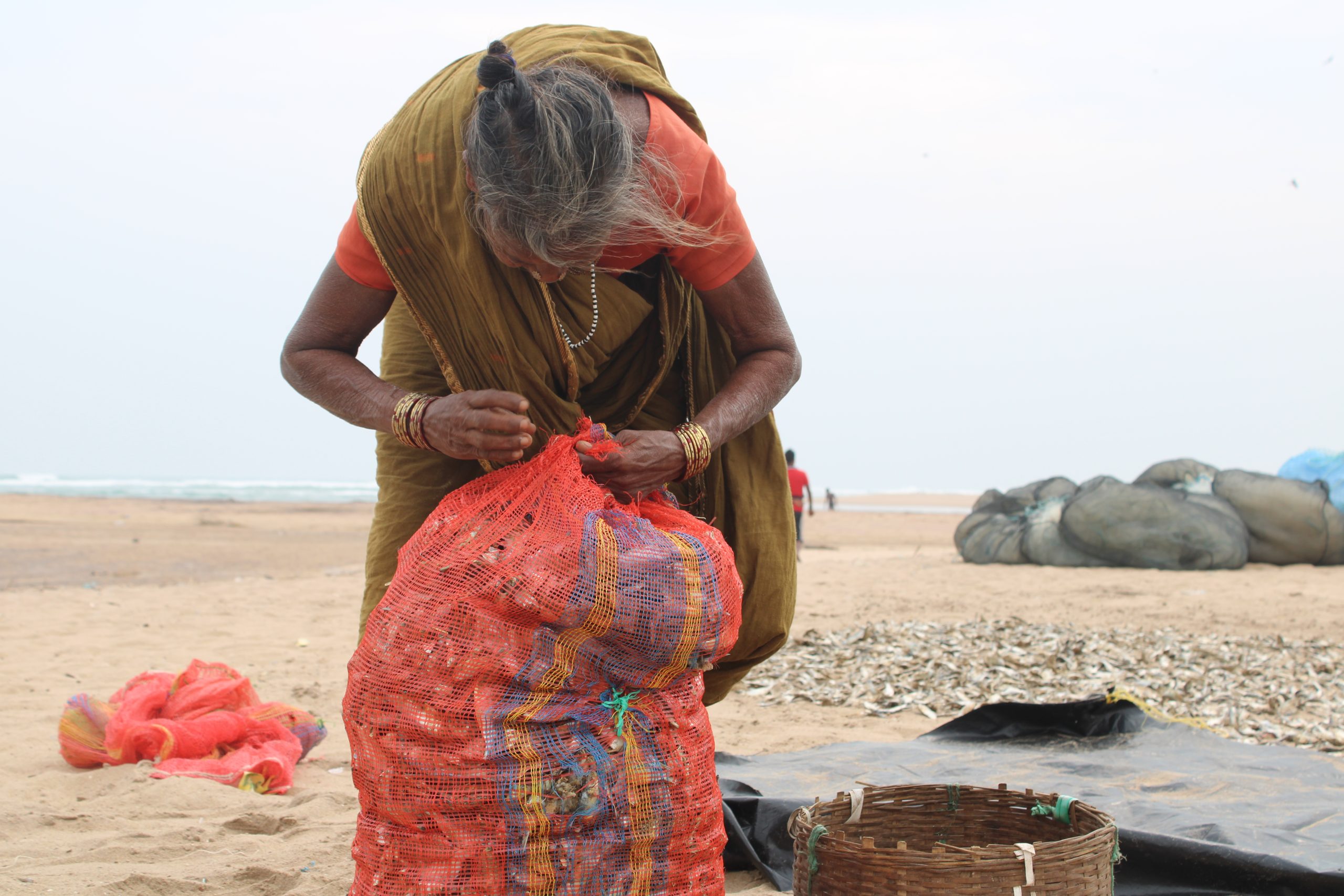 An old woman packs dry fish in a sack to sell it to a local trader in the market, at Rushikulya beach in Ganjam district, Odisha. Rakhi Ghosh/ The MigrationStory