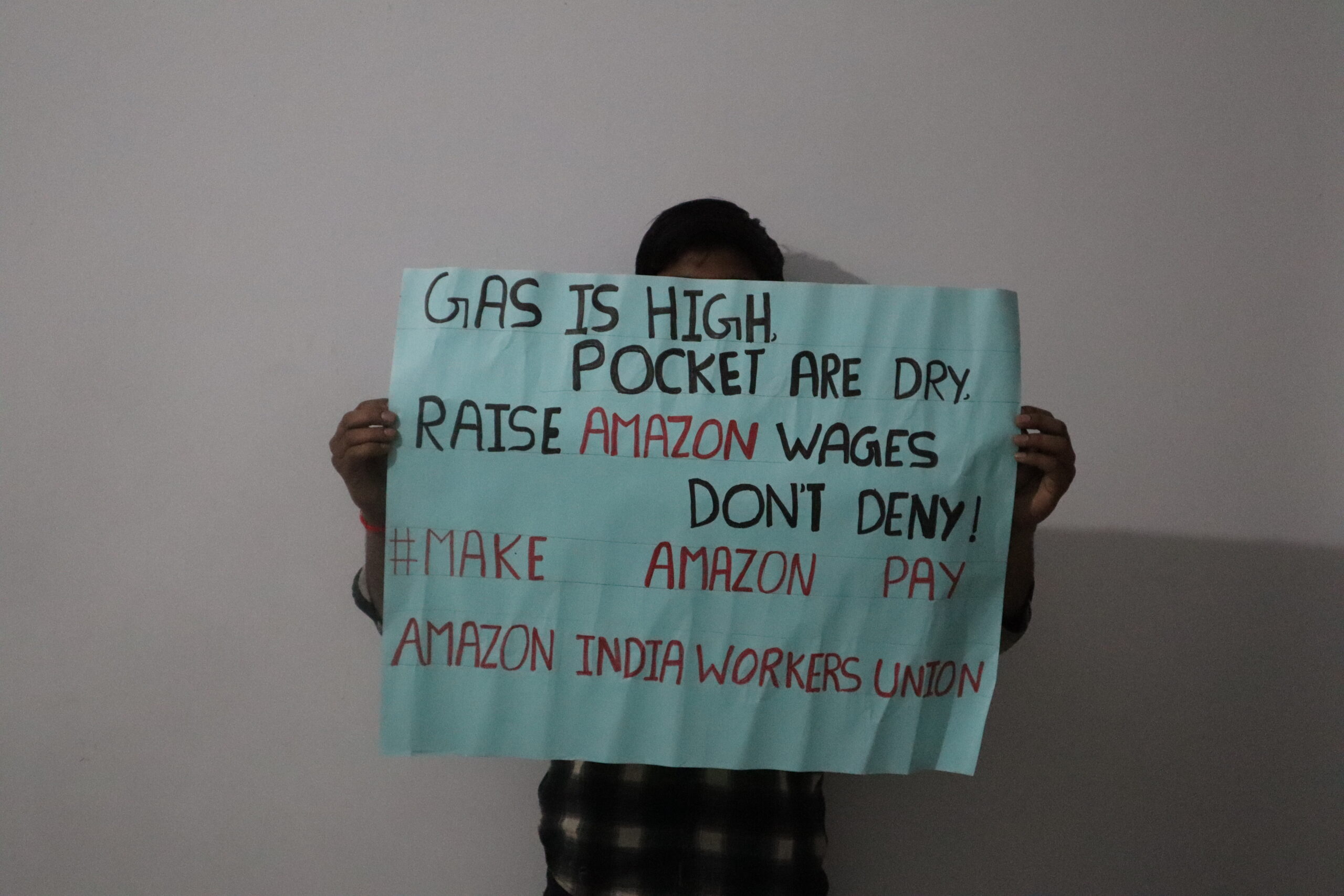 Vivek Kumar, originally from U.P.’s Hathras district, holds up a poster asking Amazon India for better wages given the spike in LPG prices. Sanskriti Talwar/The Migration Story