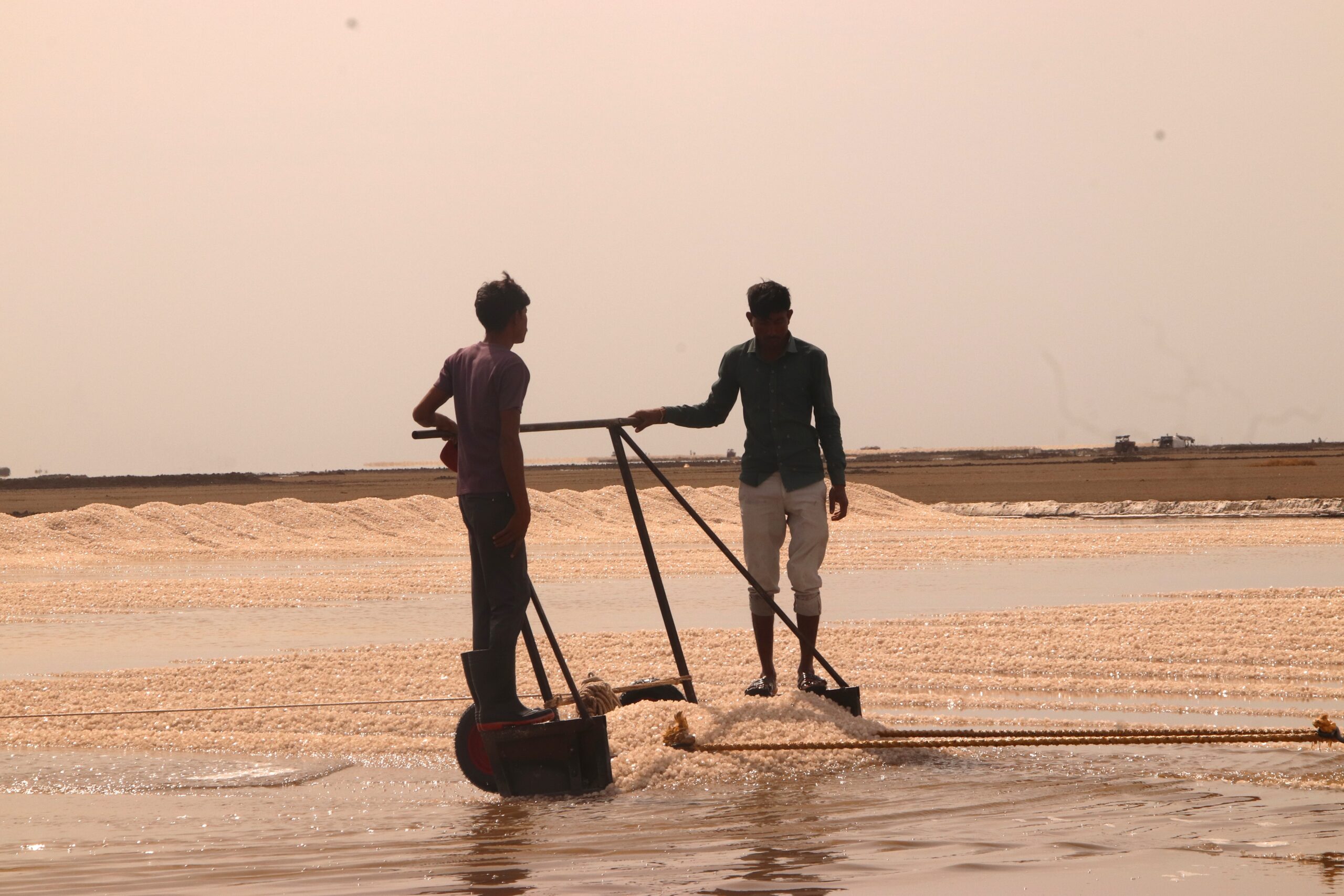 Salt makers harvest salt crystals using a hand-made trolley in the Little Rann of Kutch, Gujarat.