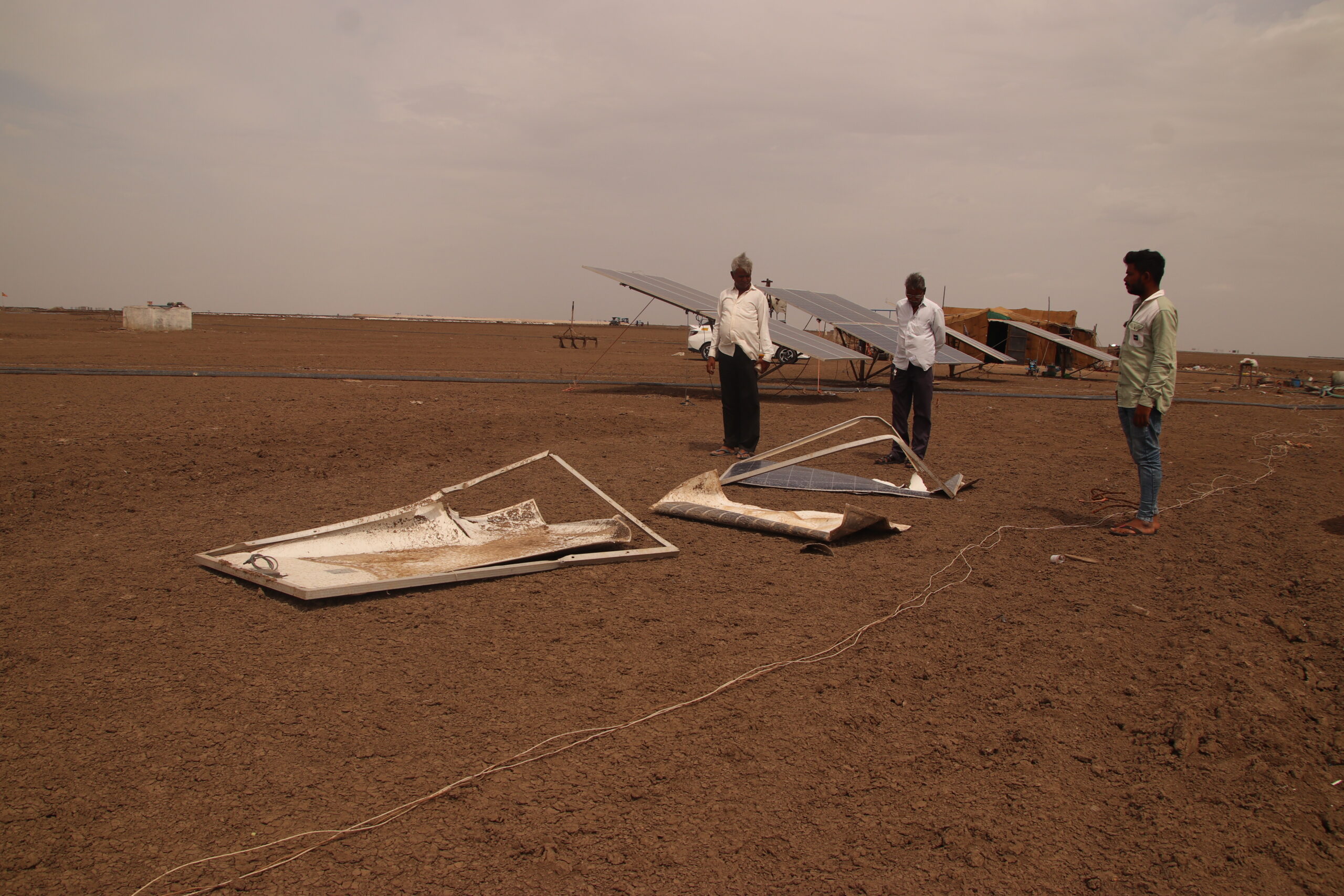 Locals look at wind-damaged solar panels in the Little Rann of Kutch, Gujarat. Aishwarya Mohanty/The Migration Story