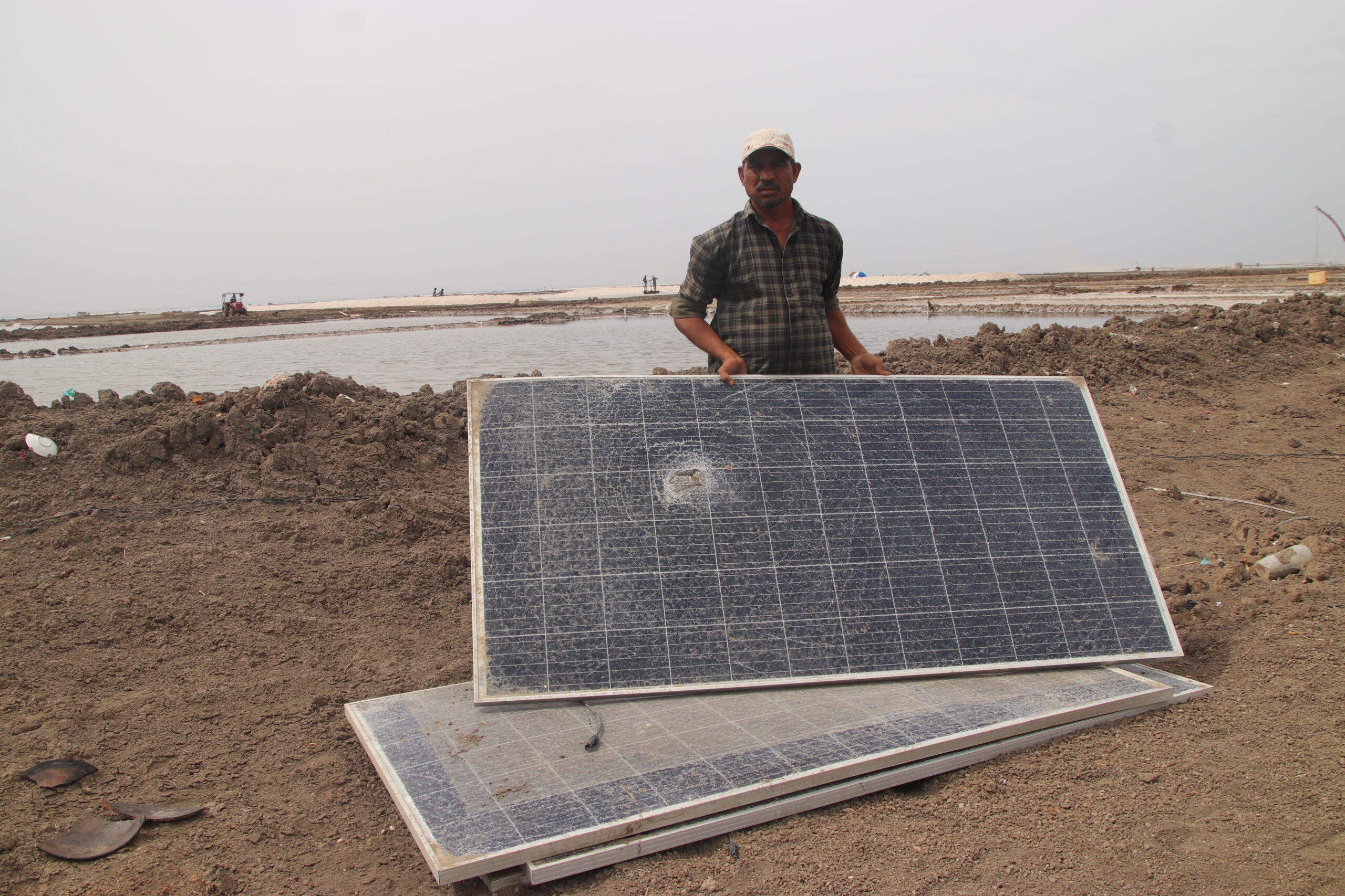 Vashiram Dedwaniya stands with his wind-damaged solar panels in the Little Rann of Kutch, Gujarat. Aishwarya Mohanty/The Migration Story