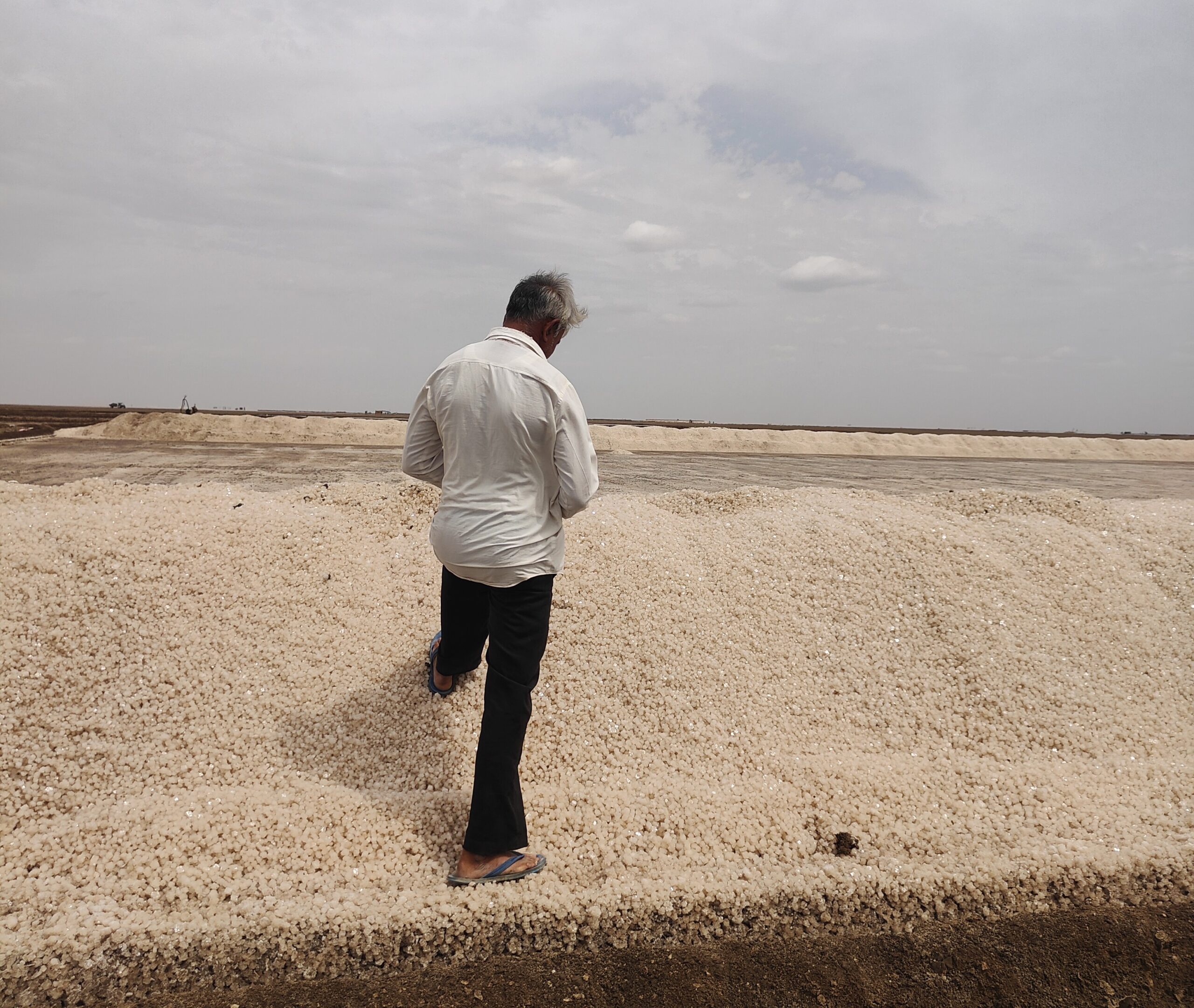Santabhai Bamaniya stands on a heap of salt crystals ready to be sold in the Little Rann of Kutch, Gujarat. Aishwarya Mohanty/The Migration Story