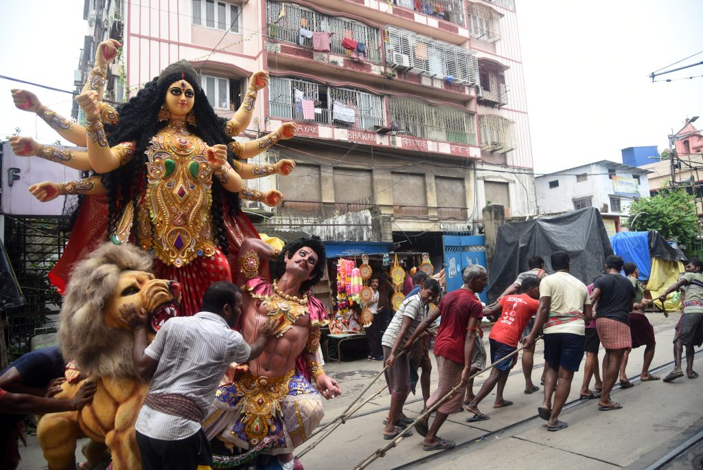 Migrant porters carry idols from workshops to puja pandals in North Kolkata.