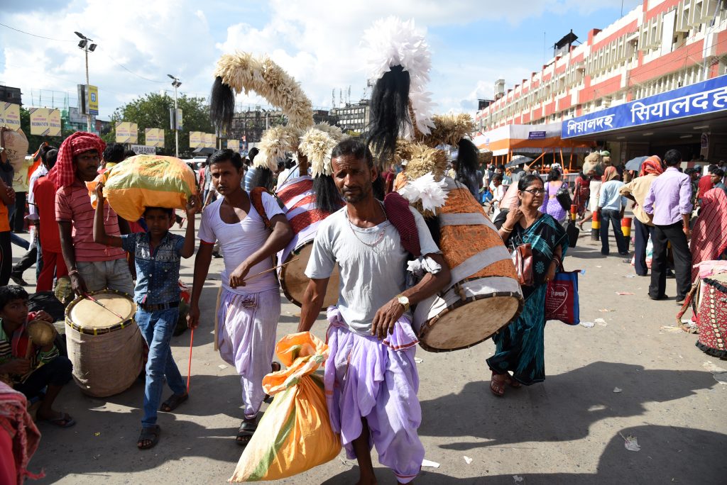 Asesh Das, a traditional dhaki from Burdwan district, located over 100 km from Kolkata, arrives at Sealdah station three days before the puja begins.