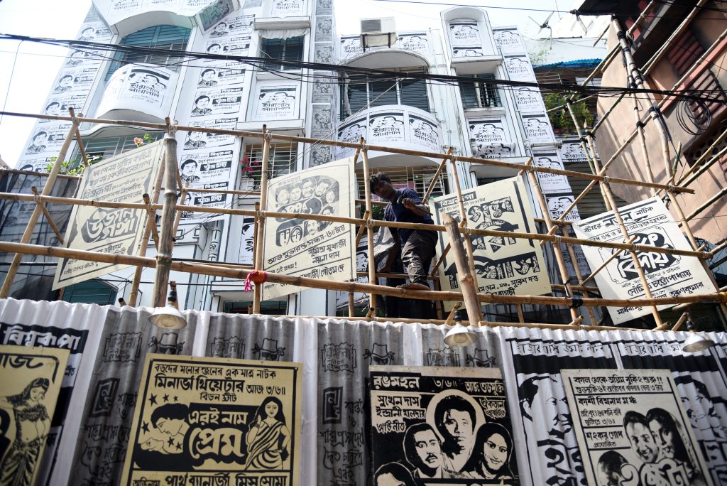 Migrant workers construct a pandal in North Kolkata, that celebrates the rich history of Bengali theatre. The artists have recreated old theatre structures and designed vintage-style posters to showcase the glorious past of Bengali stagecraft.