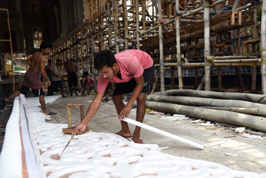 Rajib Ghorui assists his brothers in decorating a central Kolkata puja pandal.
